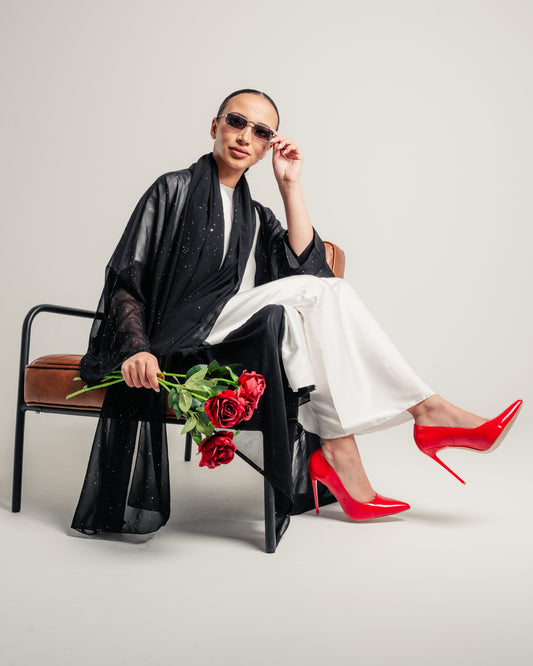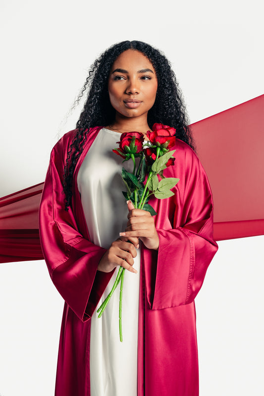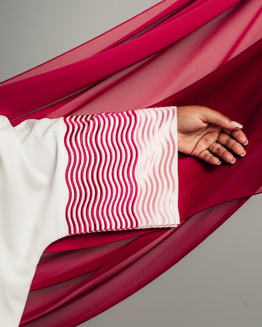 Red & Pink Embrioded Waves Sleeve Detail - White Open Abaya