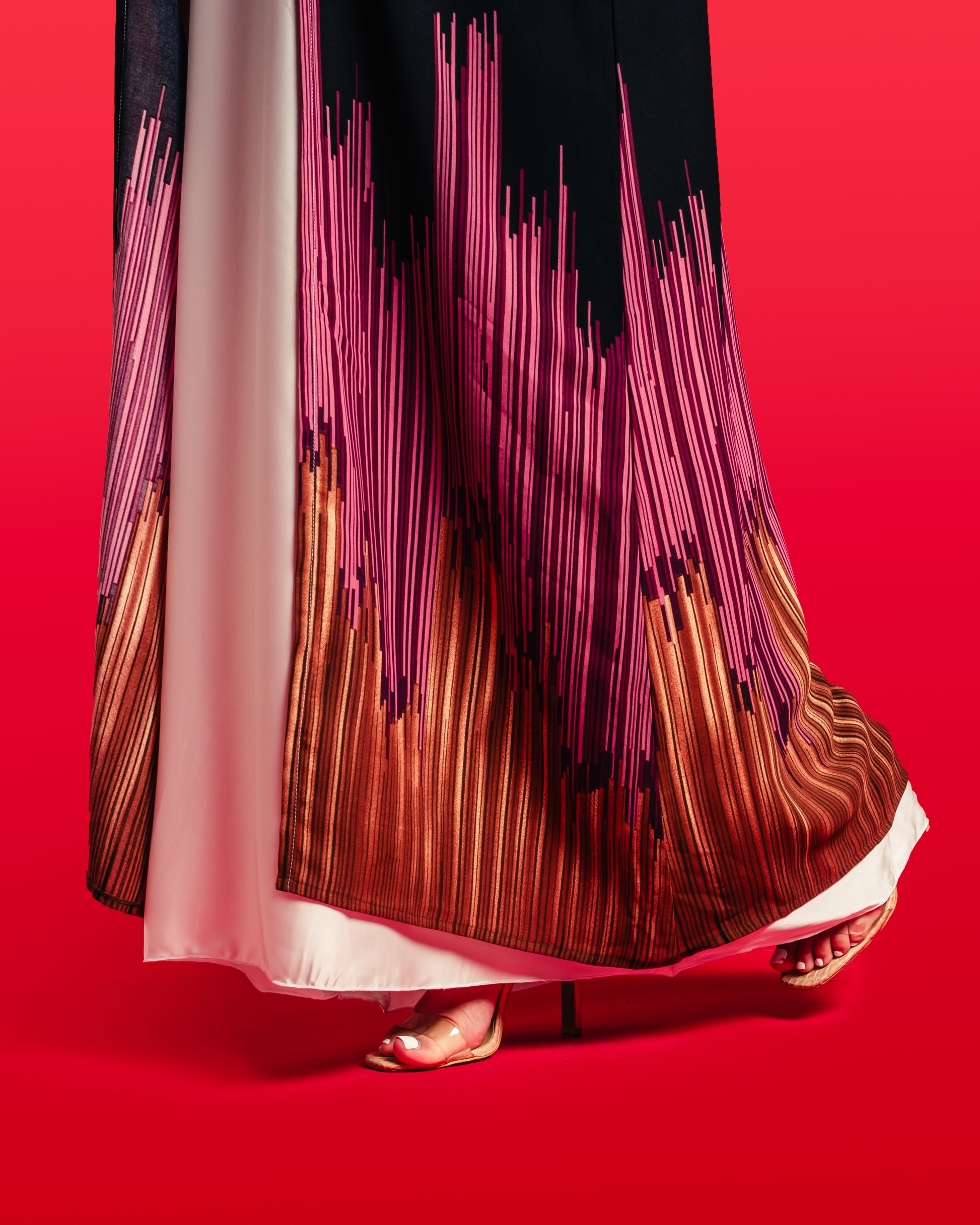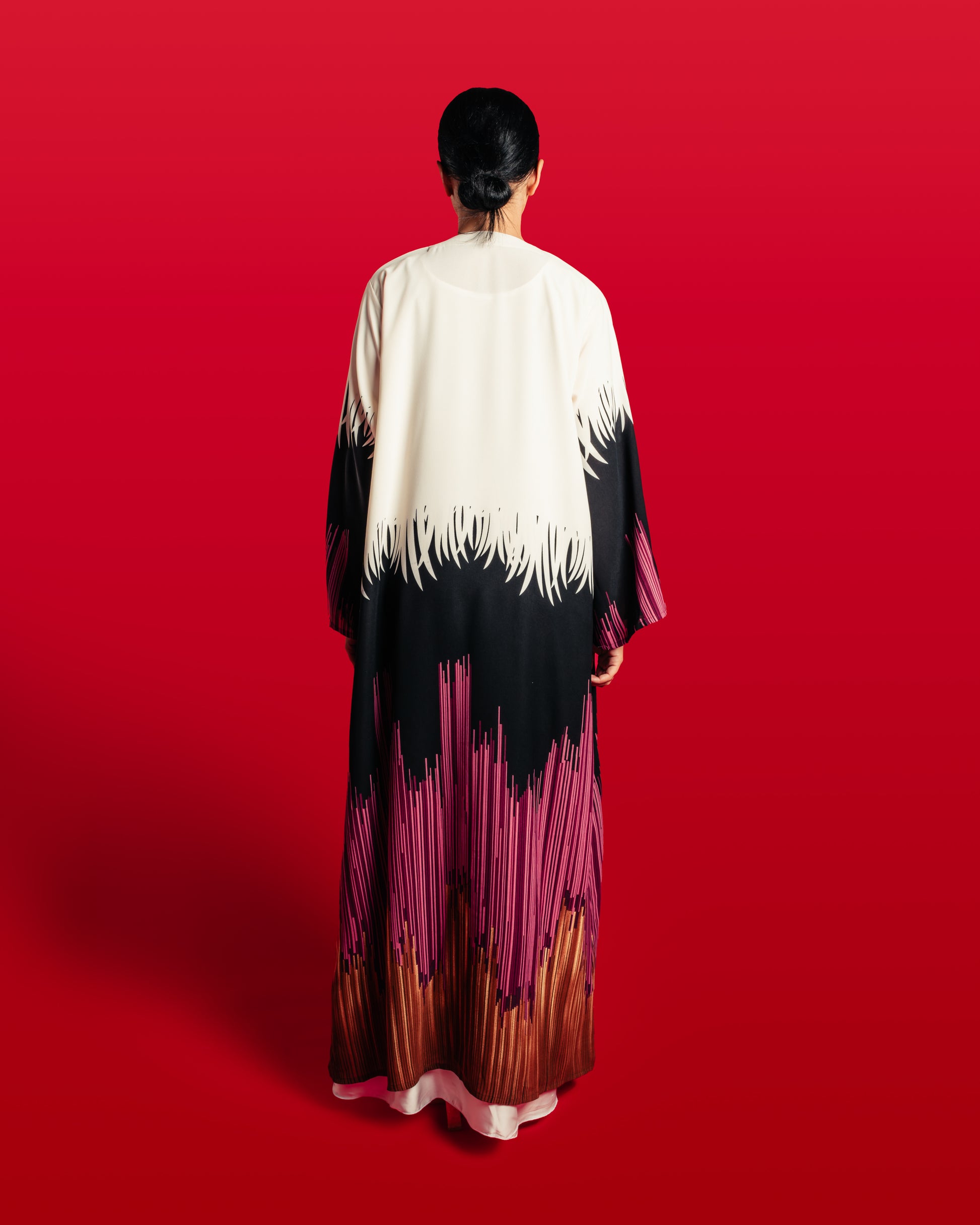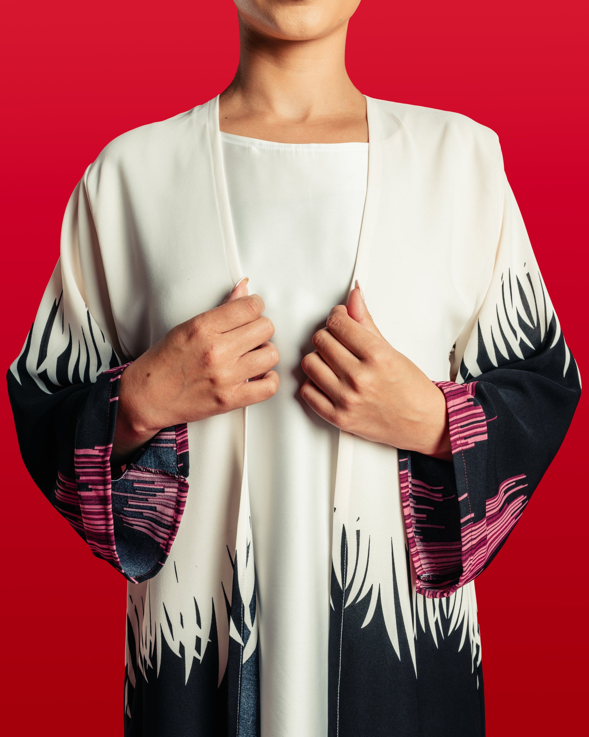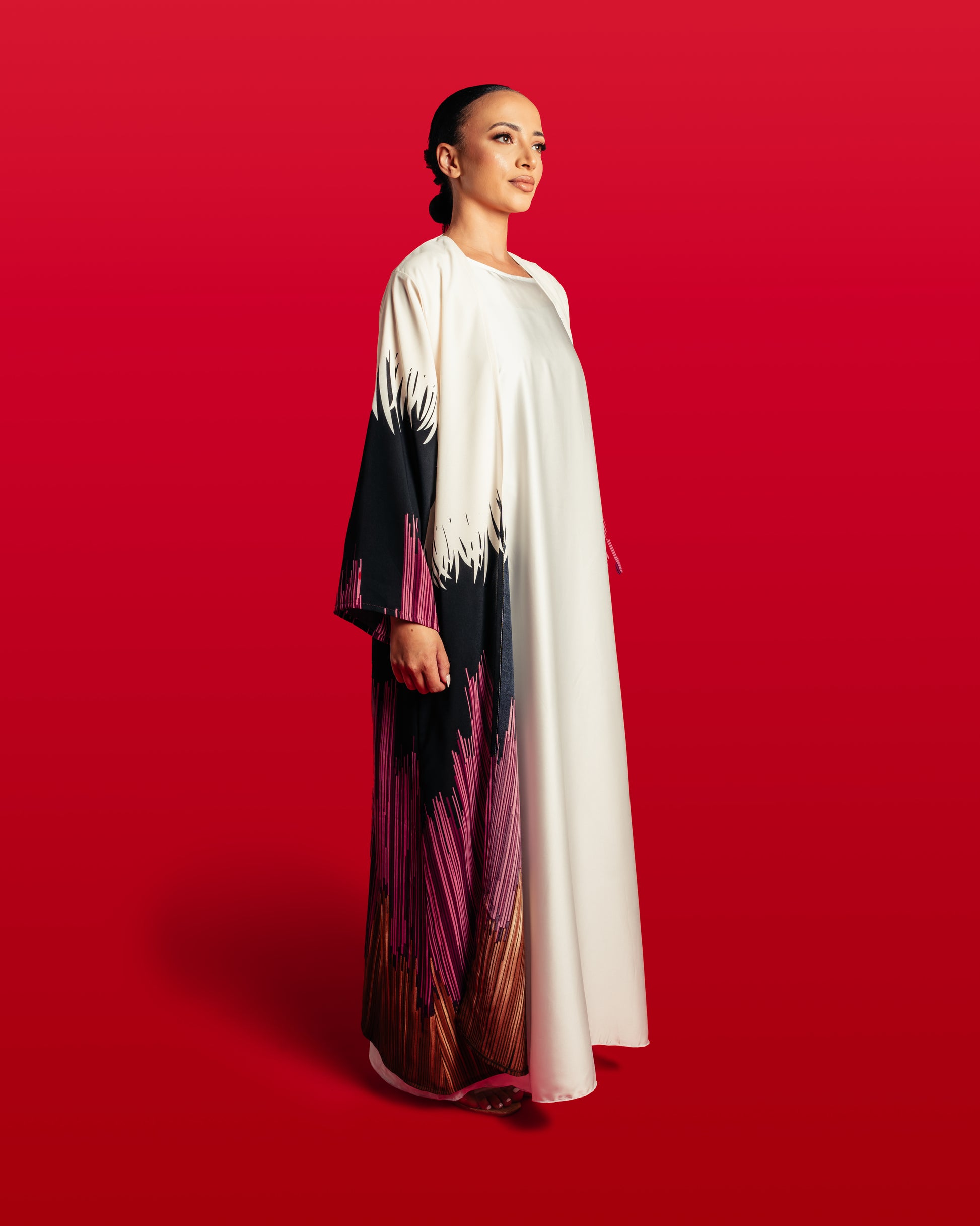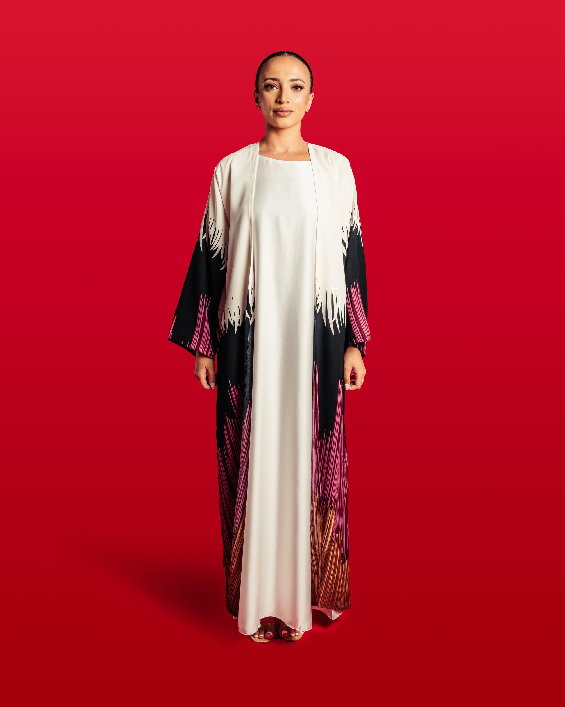 Purple Orchid is a gentle polyester abaya featuring a geometric print extending from the waist to the hem, adding a touch of modernity to its soft elegance.